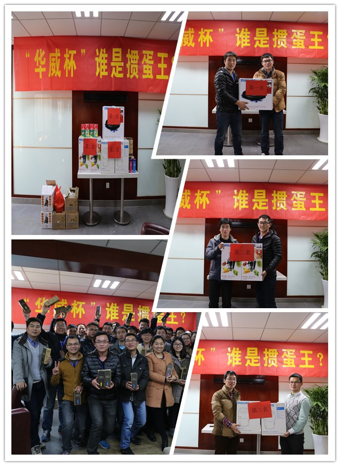 為迎接2016年新春,豐富員工業余文化生活,提高職工團隊協作意識,促進職工之間的相互交流,公司特舉辦“華威杯”迎新年摜蛋大賽。比賽由員工自由組合和配對,共48對選手參與了比賽。本著友誼第一,比賽第二的精神,比賽現場既有緊張的比賽氛圍,也充滿了歡聲笑語。經過40余場的激烈角逐,來自合成三部的賈凱、寧朋獲得了第一名,來自合成六部的沈東、于智宇獲得了第二名,來自合成三部的趙冬冬、程奇獲得第三名。