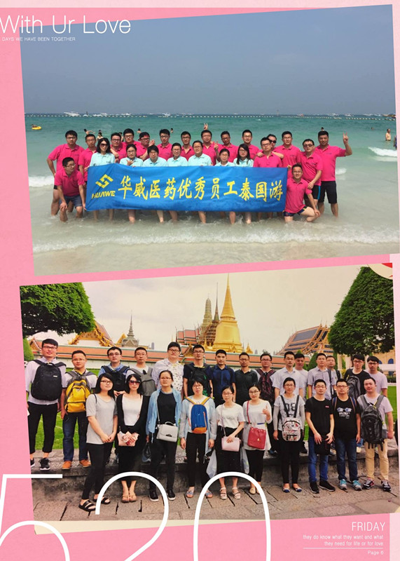 為表彰華威醫藥2015年度優秀員工,第二批25名優秀員工在2016年11月18日踏上了為期6天素有“微笑之國”的泰國之旅。同事們參觀了皇室大王宮、玉佛寺,感受佛教為泰國人的國教,體驗暹羅風情--長尾船游湄南河水上市場,風情園感受泰國潑水節,探險船大戰鱷魚湖,喂鱷魚,騎大象,乘快艇乘風破浪直飛芭堤雅的珊瑚島和金沙島,欣賞了當地特色,人妖歌舞表演秀等多彩活動。