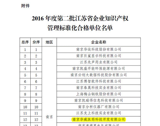 近日,接到蘇知發〔2016〕190號通知,華威醫藥順利通過知識產權管理體系“貫標”審核,成功獲批江蘇省知識產權“貫標”合格單位,使得公司知識產權的風險防范與自我保護多了一重保障,也進一步地給廣大客戶的權益增添了一重保障。
