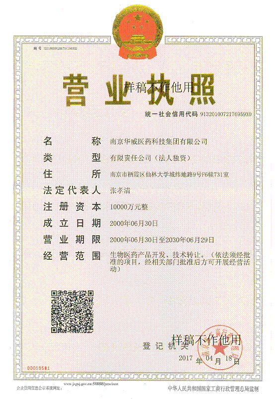 承蒙合作伙伴及社會各界對我公司的支持與厚愛,使我公司得以良性持續發展,為適應市場和公司戰略發展需要,現成立集團公司,并從2017年4月18日起,將原母公司名稱“南京華威醫藥科技開發有限公司”變更為“南京華威醫藥科技集團有限公司”,公司的一切業務不變。因公司名稱的變更給您帶來的不便敬請諒解,我們將一如既往為您提供優質的服務。