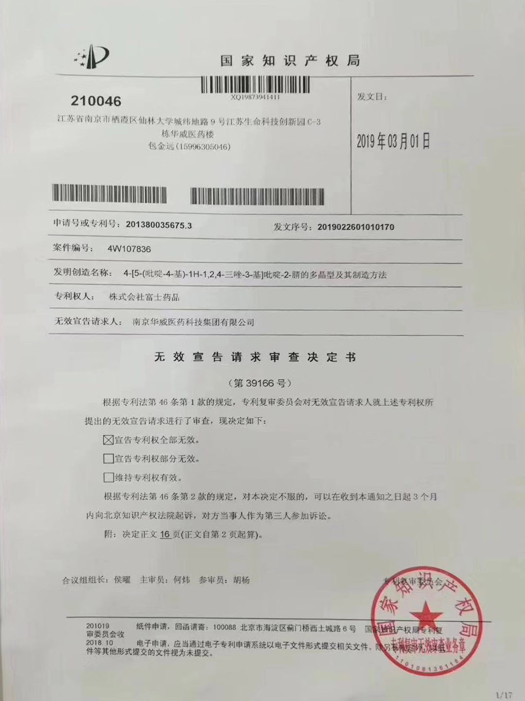 2019年3月1日,接國(guó)家知識(shí)產(chǎn)權(quán)局專利復(fù)審委員會(huì)無(wú)效宣告請(qǐng)求審查決定書(shū),華威醫(yī)藥集團(tuán)成功無(wú)效日本富士藥品“托吡司特晶型專利”,宣告其發(fā)明專利CN104411700B(專利申請(qǐng)?zhí)枮?01380035675.3,專利權(quán)屆滿日2033年)的專利權(quán)全部無(wú)效。該項(xiàng)目的原研晶型專利技術(shù)在中國(guó)失去了專利權(quán),加速了中國(guó)痛風(fēng)類藥品新時(shí)代的來(lái)臨!