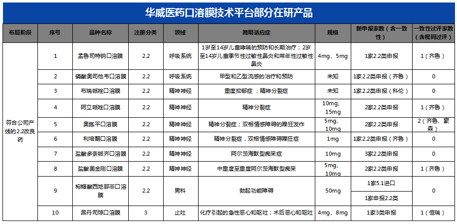 華威醫(yī)藥在口溶膜劑領(lǐng)域具備著充足的經(jīng)驗積累和研究心得,無論是制備工藝、API篩選、治療領(lǐng)域等方向,均已形成了成熟的體系: