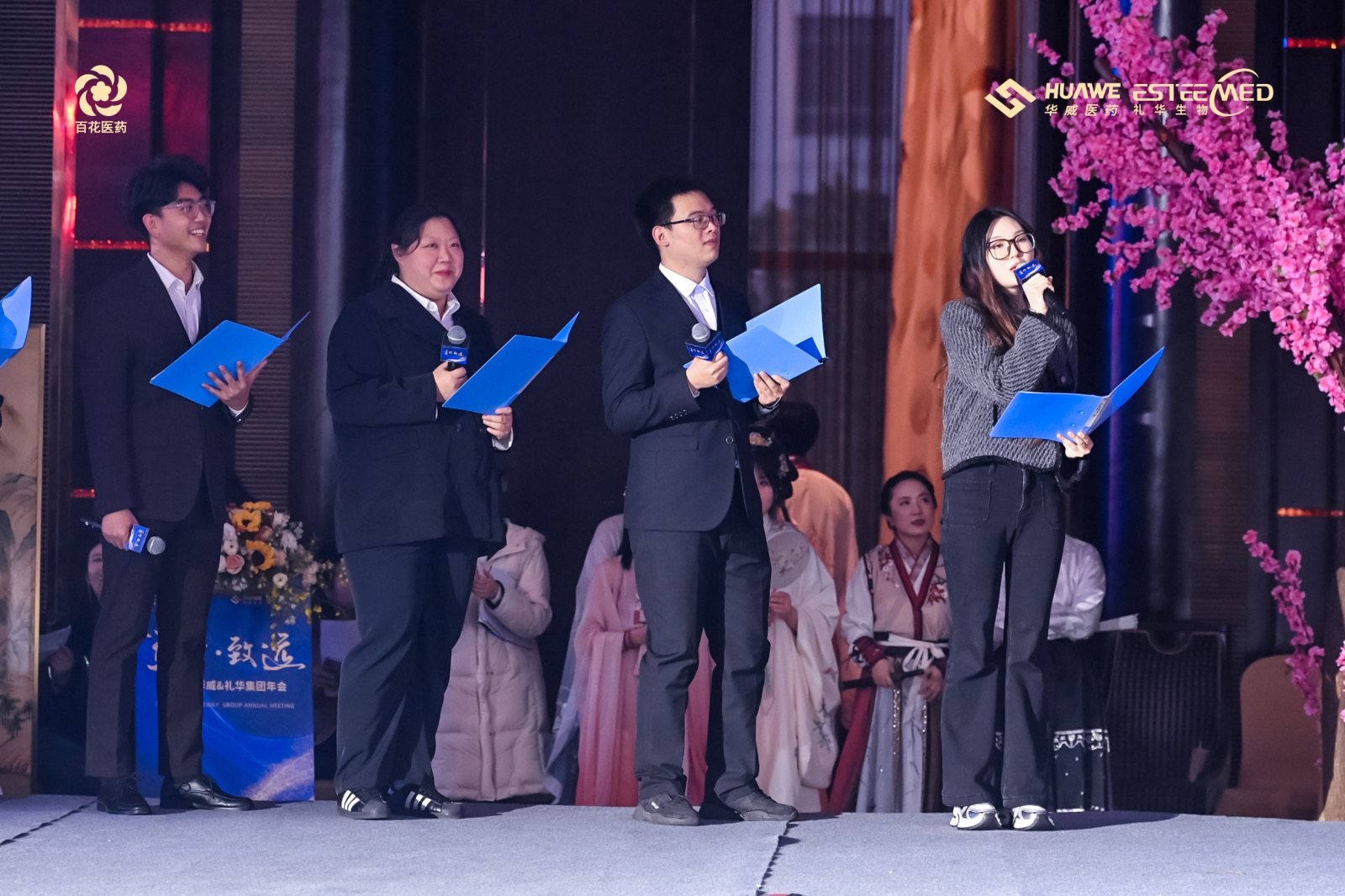 氣勢恢宏、勢如破竹的舞龍開場秀《龍耀九州》、行云流水輕盈翩躚的中華古典舞《百舞驚鴻》、掌握財富密碼,讓現場氛圍感滿滿的小品《財神來敲我家門》、奔放節奏,曼妙身姿的舞蹈《疆舞飛揚》、用歌曲訴說遙遠星河神秘浪漫的獨唱《水星記》、將藥研故事搬上舞臺,以輕松幽默的方式展現工作時光的小品《誰來拯救周末》、青春律動的時尚舞蹈《Miniskrit》、京劇發展下重要里程碑代表作——戲曲《梨花頌》、獨具匠心,用聲音“描繪”角色的配音秀《公司的那些事》以及以服飾為載體,以走秀為舞臺,跨越時空華麗邂逅的走秀《漢風雅韻》,讓2024年會上半場的氣氛持續沸騰。